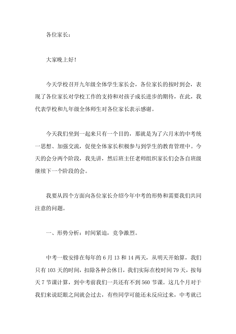 九年级(初三)最后一学期的家长会,校长讲话,主要讲了4个方面