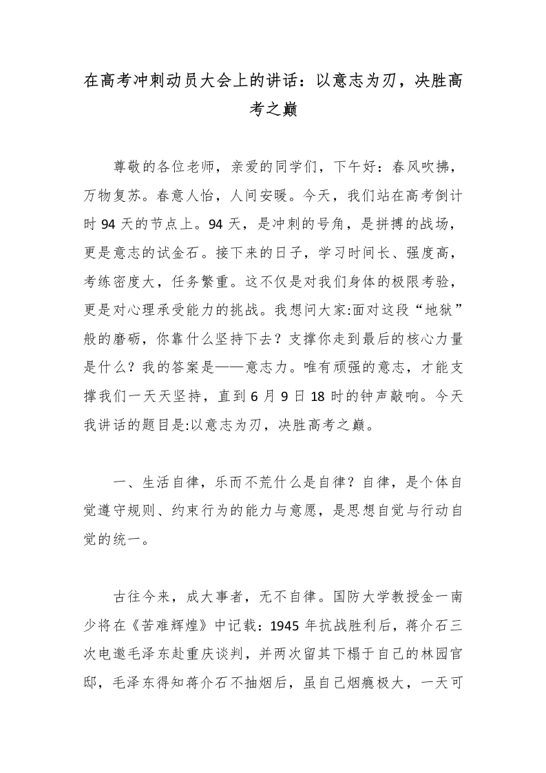 在高考冲刺动员大会上的讲话:以意志为刃,决胜高考之巅