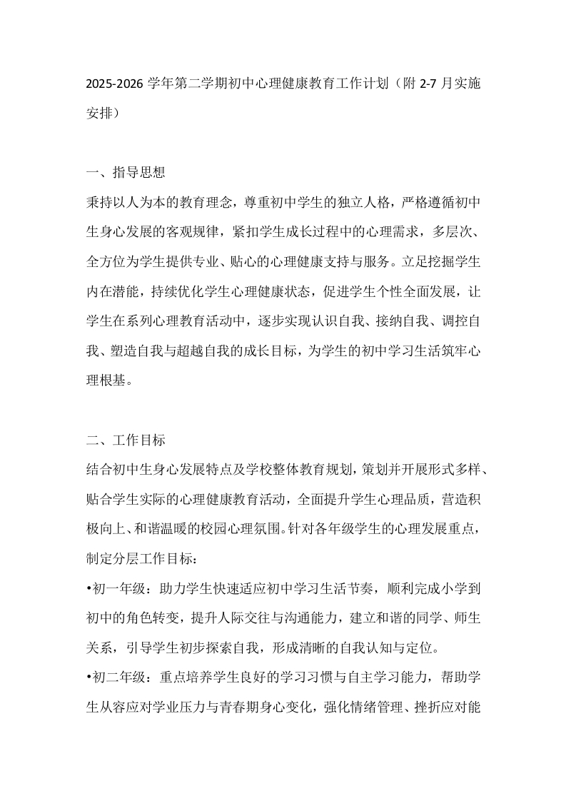 2025-2026学年第二学期初中心理健康教育工作计划(附2-7月实施安排)