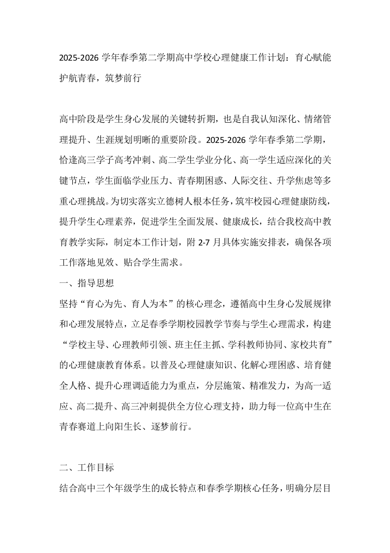 2025-2026学年春季第二学期高中学校心理健康工作计划:育心赋能 护航青春,筑梦前行