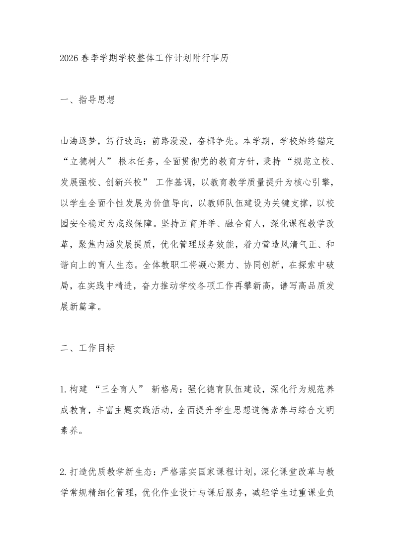 2026春季学期学校整体工作计划附行事历