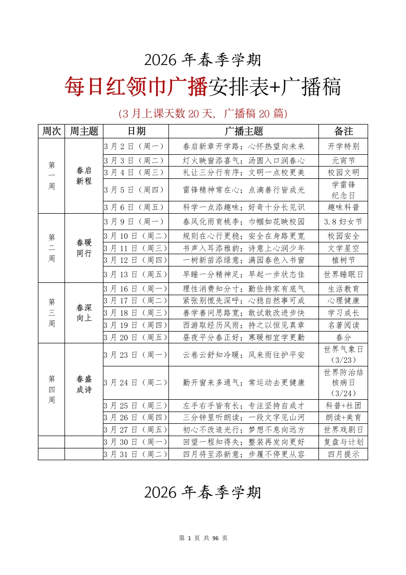 2026年春季学期每日红领巾广播安排表及广播稿(3-4月)