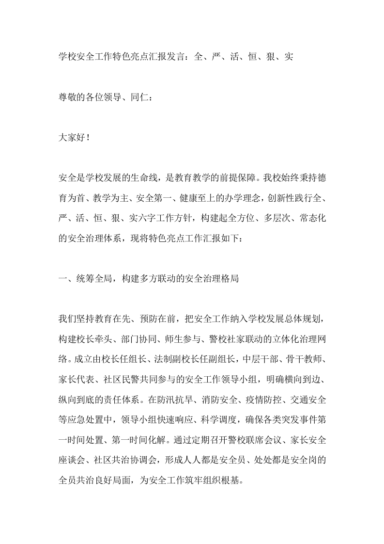 学校安全工作特色亮点汇报发言:全、严、活、恒、狠、实