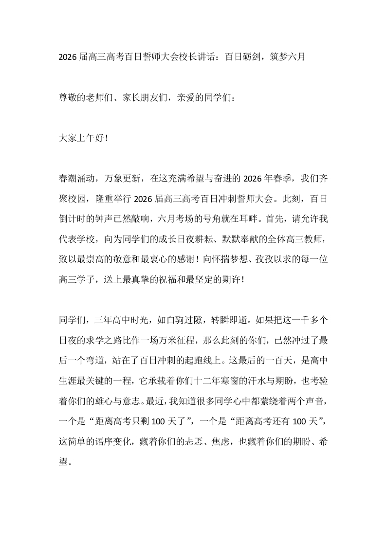 2026届高三高考百日誓师大会校长讲话:百日砺剑,筑梦六月