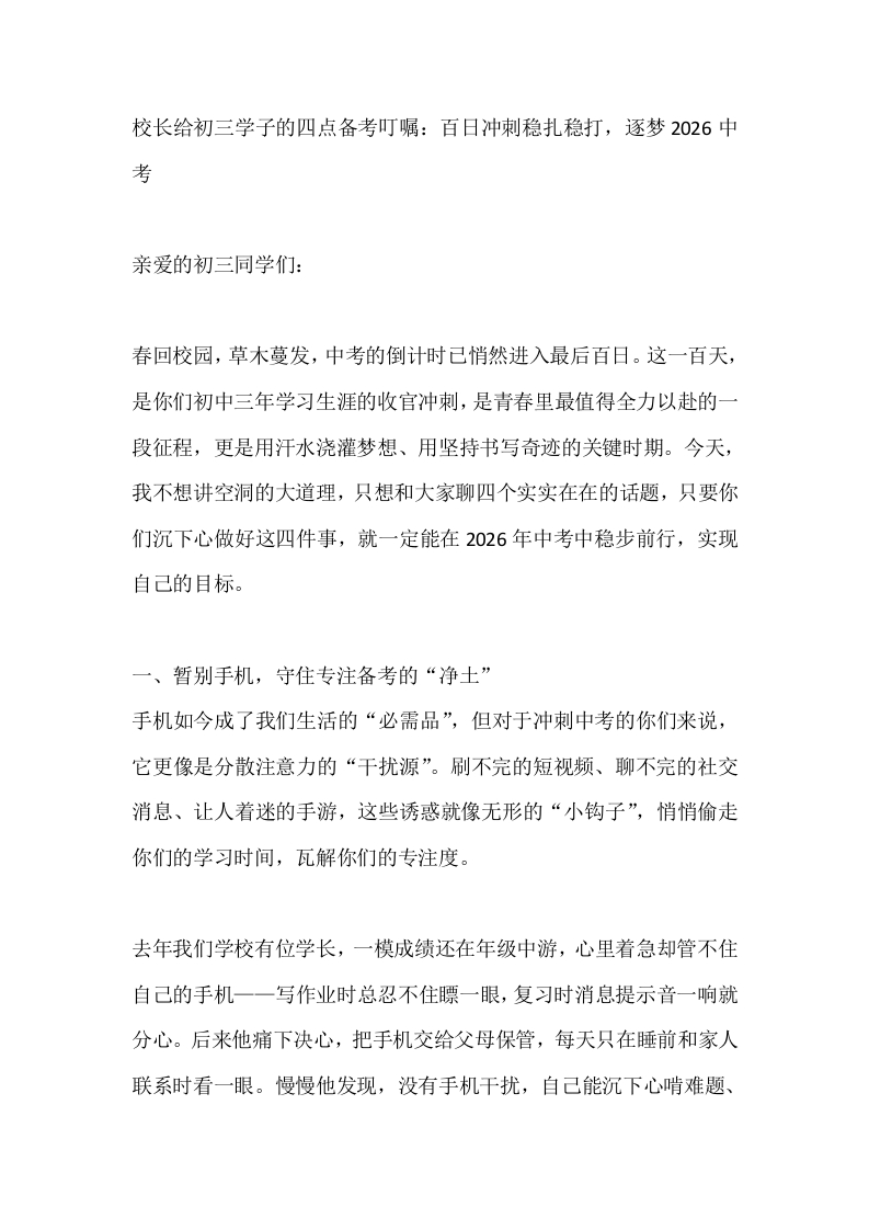 校长给初三学子的四点备考叮嘱:百日冲刺稳扎稳打,逐梦2026中考