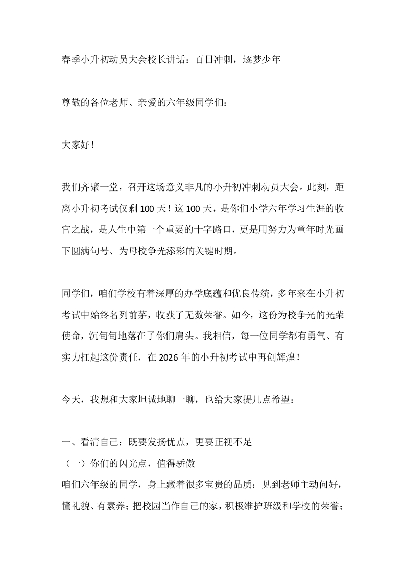 春季小升初动员大会校长讲话:百日冲刺,逐梦少年