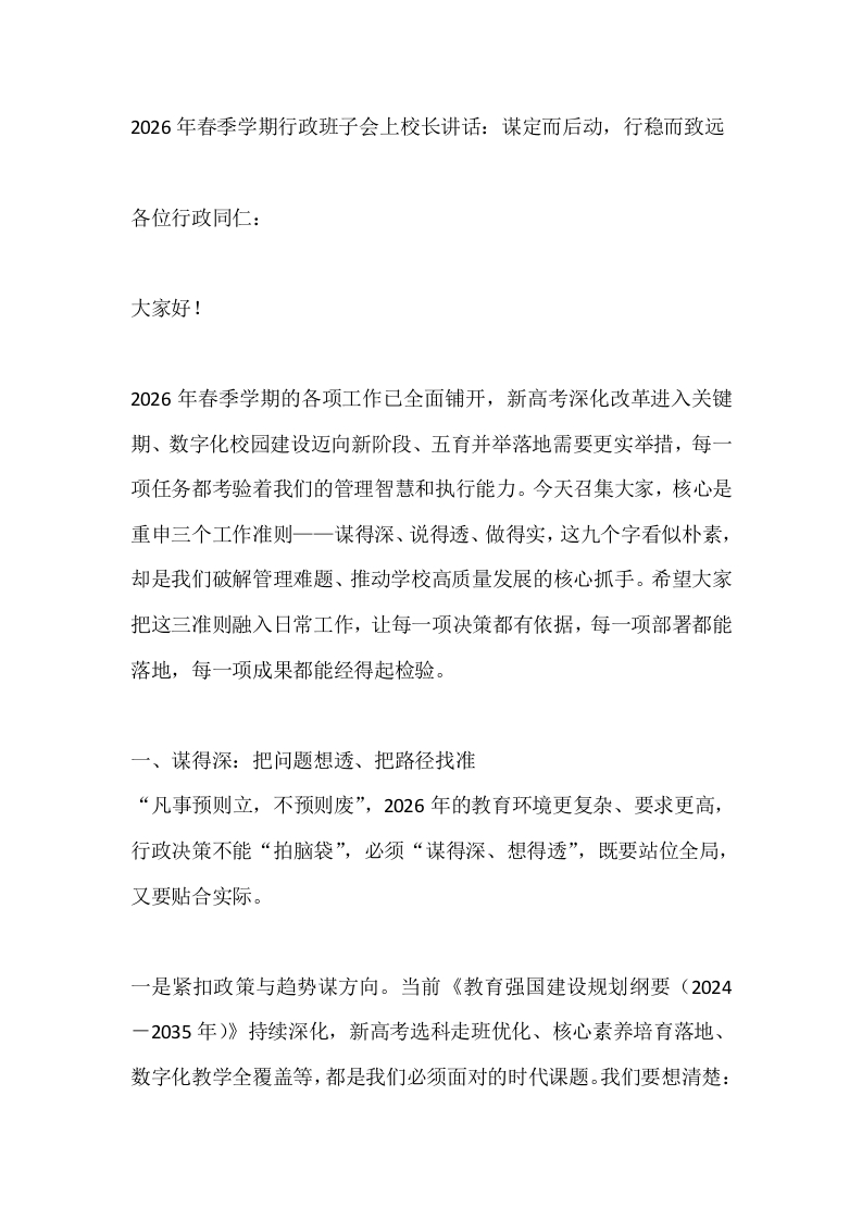 2026年春季学期行政班子会上校长讲话:谋定而后动,行稳而致远