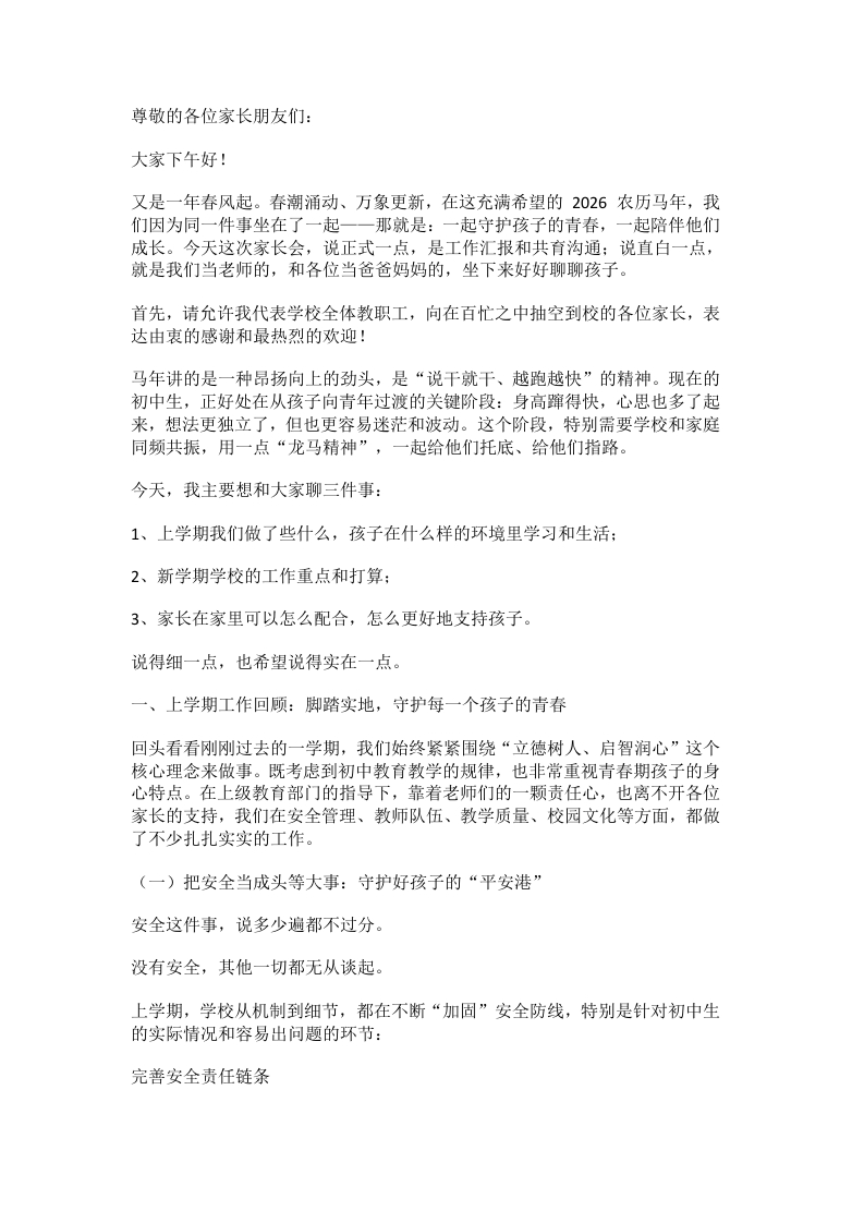 2026马年春季学期家长会,初中校长发言:马年扬鞭再出发 家校同心赢中考