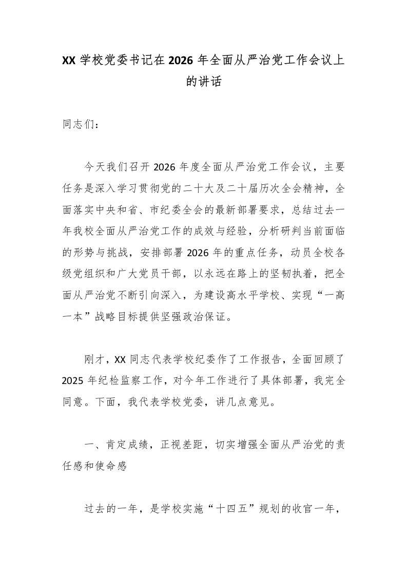 XX学校党委书记在2026年全面从严治党工作会议上的讲话2