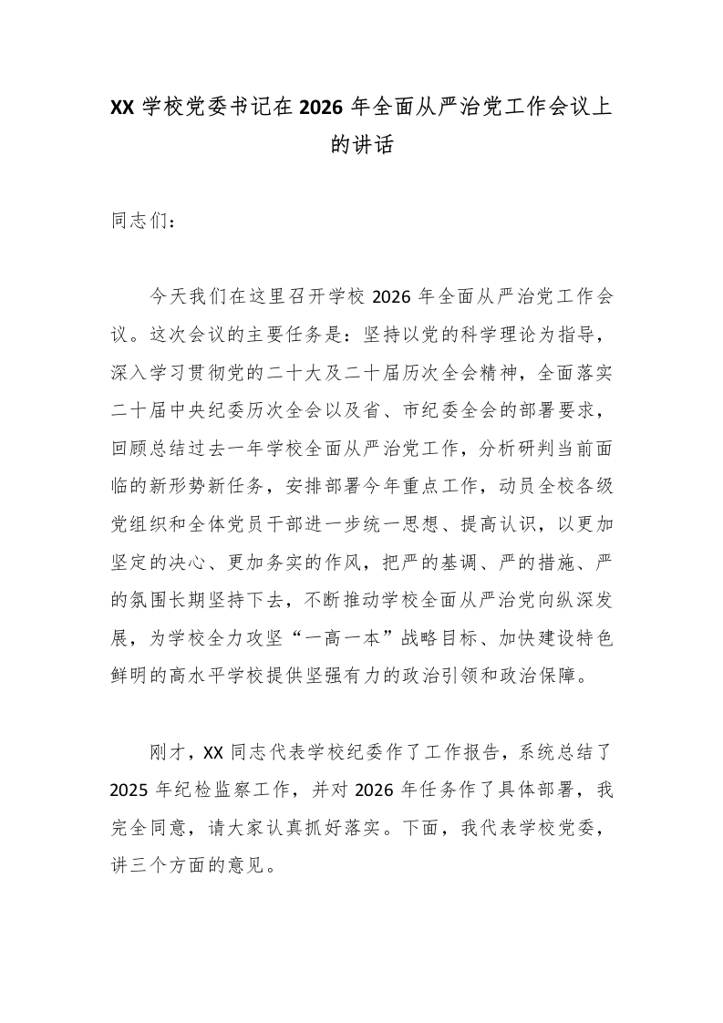 XX学校党委书记在2026年全面从严治党工作会议上的讲话3