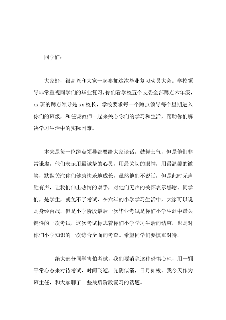 六年级毕业班动员大会,校长讲话,主要讲了6个成语,争分夺秒,去粗取精,精益求精,三人行必有我师,见贤思齐,千里之行始于足下