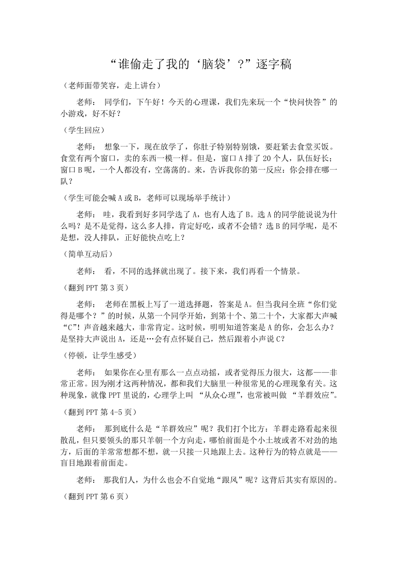 【通用】【心理健康教育】主题班会:谁偷走了我的”脑袋“逐字稿